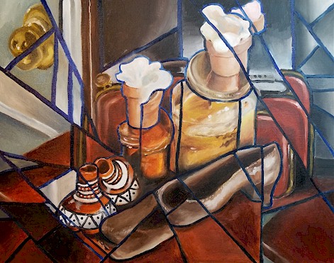 Cubist Still Life Oil on canvas. Another assignment, featuring some random objects from around the bedroom including scented candles, a vintage high-heeled shoe, and a Nintendo Switch case.